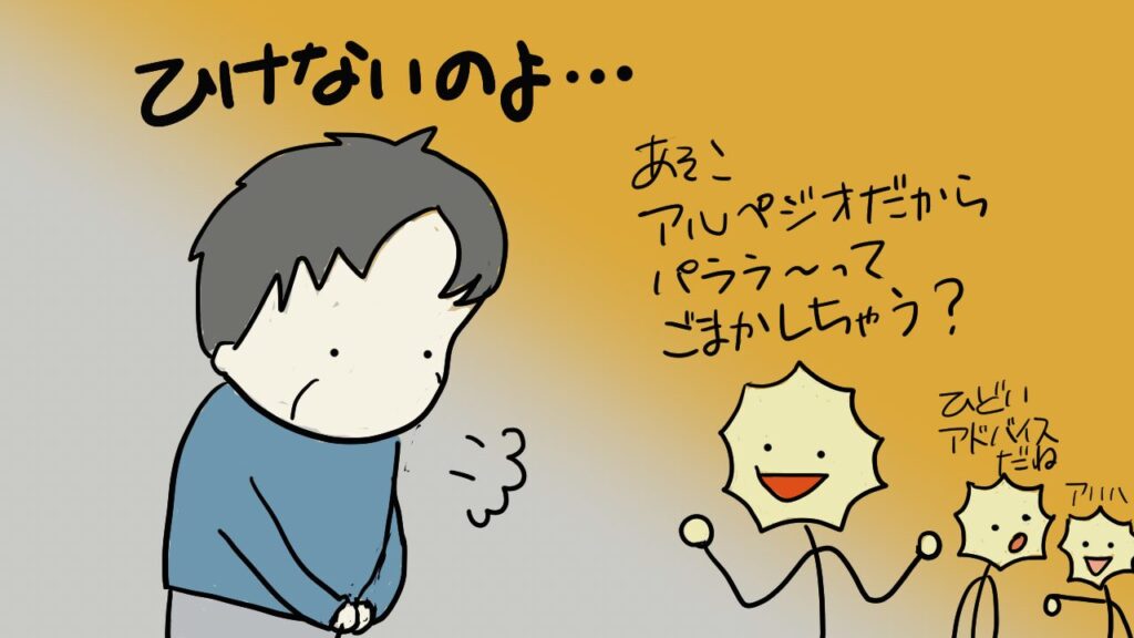 昨日から練習しているトンプソン現代ピアノ教本2より『ホフマン物語からバルカローレ』ですが、ゆっくりなら弾けるようになって、よし、ちょっとずつ速くするぞと弾いていたところ、35小節目からの右手のアルペジオの和音、ラレファ♯を124の指でとるのはまだいけるのですが、36小節目のラドファ♯を124,ラド♯ソを125でとるところが、く、くぅ…。指が固い…。開かない…。必ずそこでひっかかります。同じフレーズがもう1回出てくるので、予想通りもう一度ひっかかり、ため息をつくまでがセットになってしまいました。やれやれ。